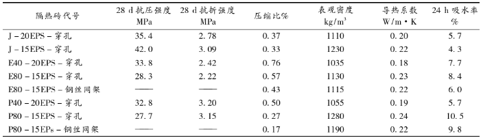 從輕質(zhì)骨料混凝土種類和層面聯(lián)接方式改變時,復(fù)合隔熱磚相關(guān)性能的結(jié)果可以得出,由于在EPS板和混凝土面層間形成了連通的水泥砂漿柱,當(dāng)試件承受抗折荷載時,大部分試件折斷面經(jīng)過處于中間的三個水泥砂漿柱,水泥砂漿柱的抗折強(qiáng)度遠(yuǎn)高于EPS板的抗折強(qiáng)度,因此與試件的抗折強(qiáng)度相比,基準(zhǔn)試件抗折強(qiáng)度均有較大幅度的提高,但相應(yīng)試件的抗壓強(qiáng)度卻有降低,這也進(jìn)一步說明EPS板的抗壓塑性有助于提高復(fù)合隔熱磚的抗折強(qiáng)度。