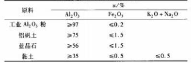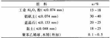 以工業(yè)Al2O3粉、粘土、燒結(jié)出色的鋁礬土和部分藍(lán)晶石為首要質(zhì)料,增加木屑(1mm挑選)和聚苯乙烯球(直徑2~0.5mm)制備輕質(zhì)磚。質(zhì)料化學(xué)組成見表1