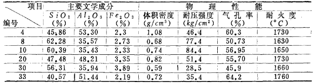 配方的選擇:以漂珠為主要原料,加入不同量軟質粘土,并用高鋁礬土來調節(jié)制品的含量,再加入少量鋸木屑及 其它添加劑,通過試驗尋求體積密度分別為0.5、0.6、0.7、0.8、0.9及l(fā).Og/cm3的各種配方。經(jīng)試驗篩選出6個較理想的配方。 試制的樣品呈淡黃或深黃色,表面致密,沒有裂紋,強度較高。試樣主要技術指標列于表3。