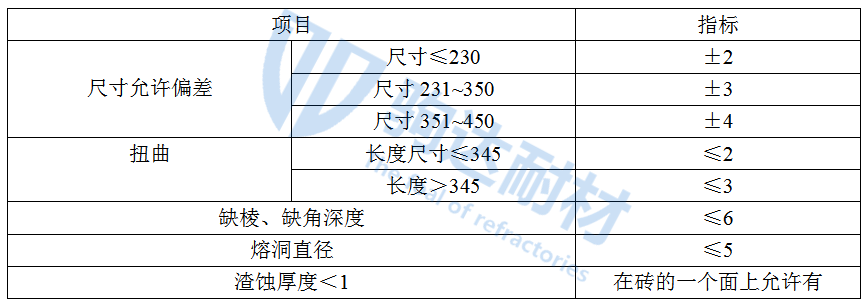YB/T5107-1993將熱風(fēng)爐用黏土質(zhì)耐火磚按理化指標(biāo)分為RN-42、RN-40、RN-36三種牌號(hào)。其理化指標(biāo)、尺寸允許偏差及外觀見(jiàn)表1和表2。