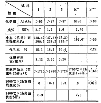 試樣配好經(jīng)混合后,用顆粒澆注法制成25×25×140(mm)的試樣和36×50(mm)的試樣。干燥(110℃×12h)后在1500℃×3h下燒成、對三種試樣的性能進行了測定并與英國和蘇聯(lián)的同類產(chǎn)品性能做比較,結果列于表三。