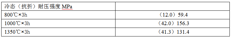 為了探索莫來石在復合膠結劑中形成的溫度,我們作了如下試驗,對1#試樣的生坯分別以800℃×3h,1000℃×3h和1350℃×3h燒后測其冷態(tài)強度,結果如下: